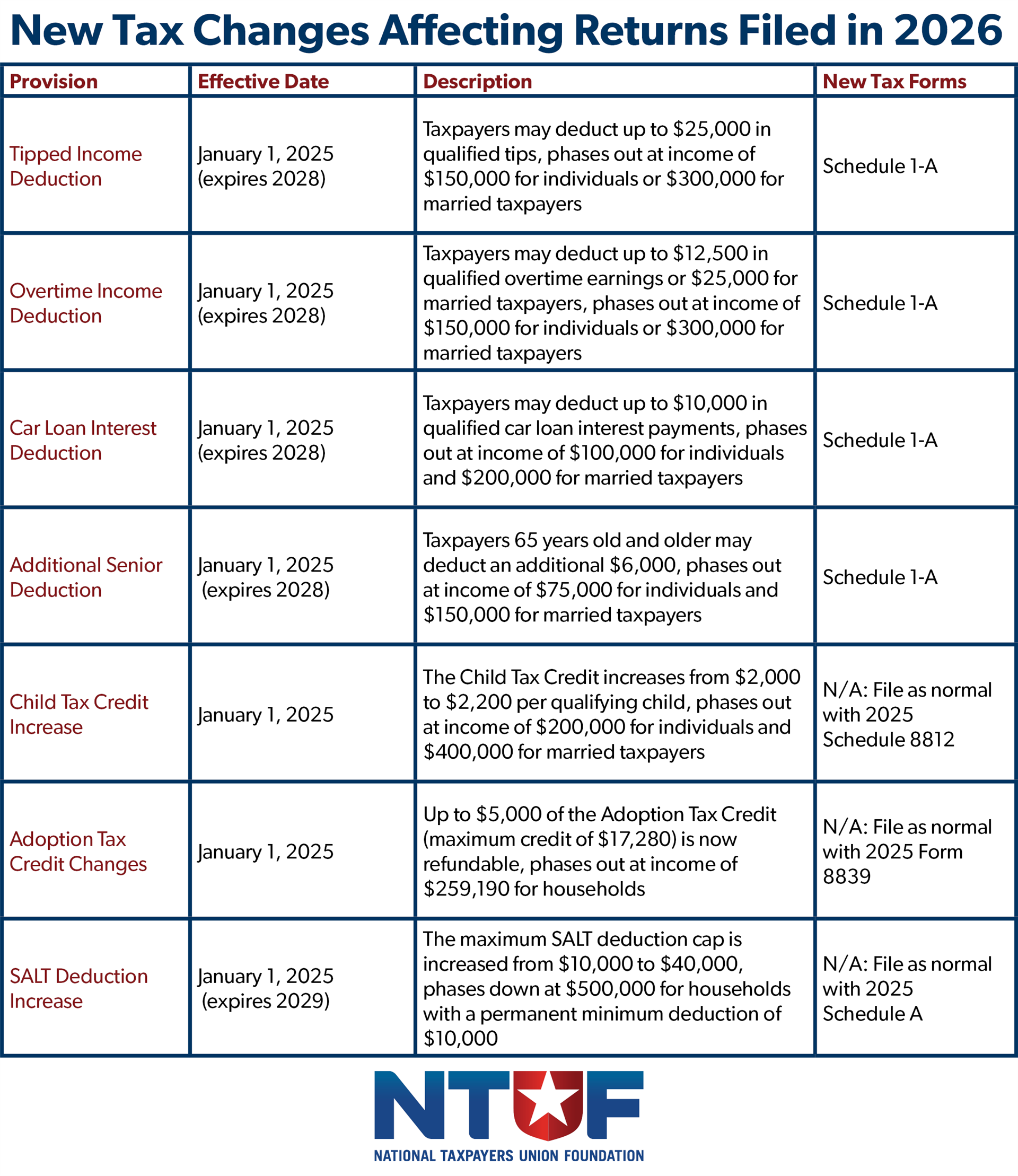 Importantly, OBBBA’s new individual tax deductions were enacted retroactively, meaning that taxpayers can claim these deductions for all 2025 earnings. Most of OBBBA’s provisions affecting individuals took effect in 2025, but some changes begin in 2026 and will require recordkeeping for 2027 tax returns.