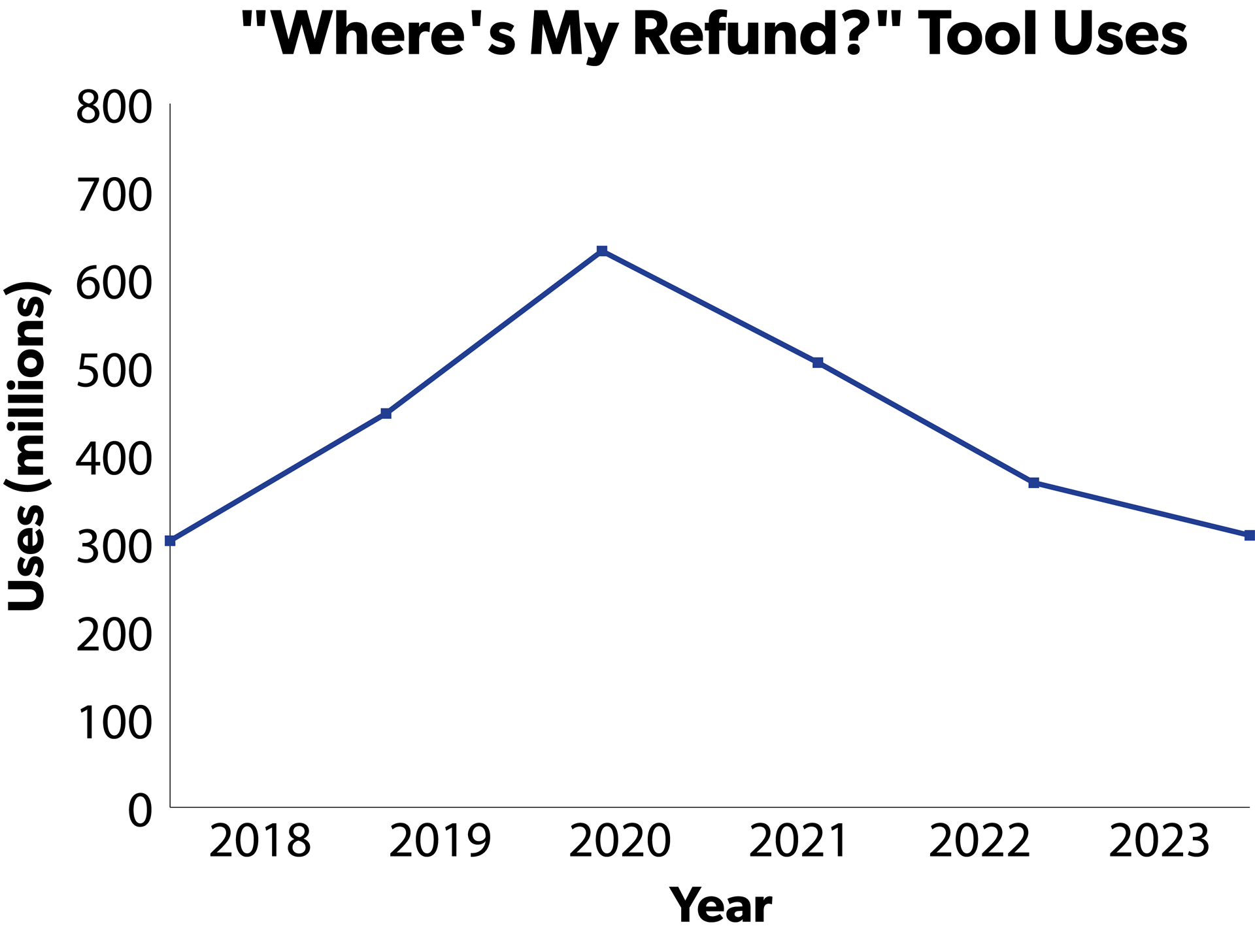 The figures in the chart from the Strategic Operating Plan update appear to be for the filing season, whereas the Data Book numbers are per fiscal year. The Data Book shows 303 million uses of “Where’s My Refund?” in fiscal year 2023, whereas the Strategic Operating Plan update records only 213 million for the 2023 filing season and 275 million for the 2024 filing season.