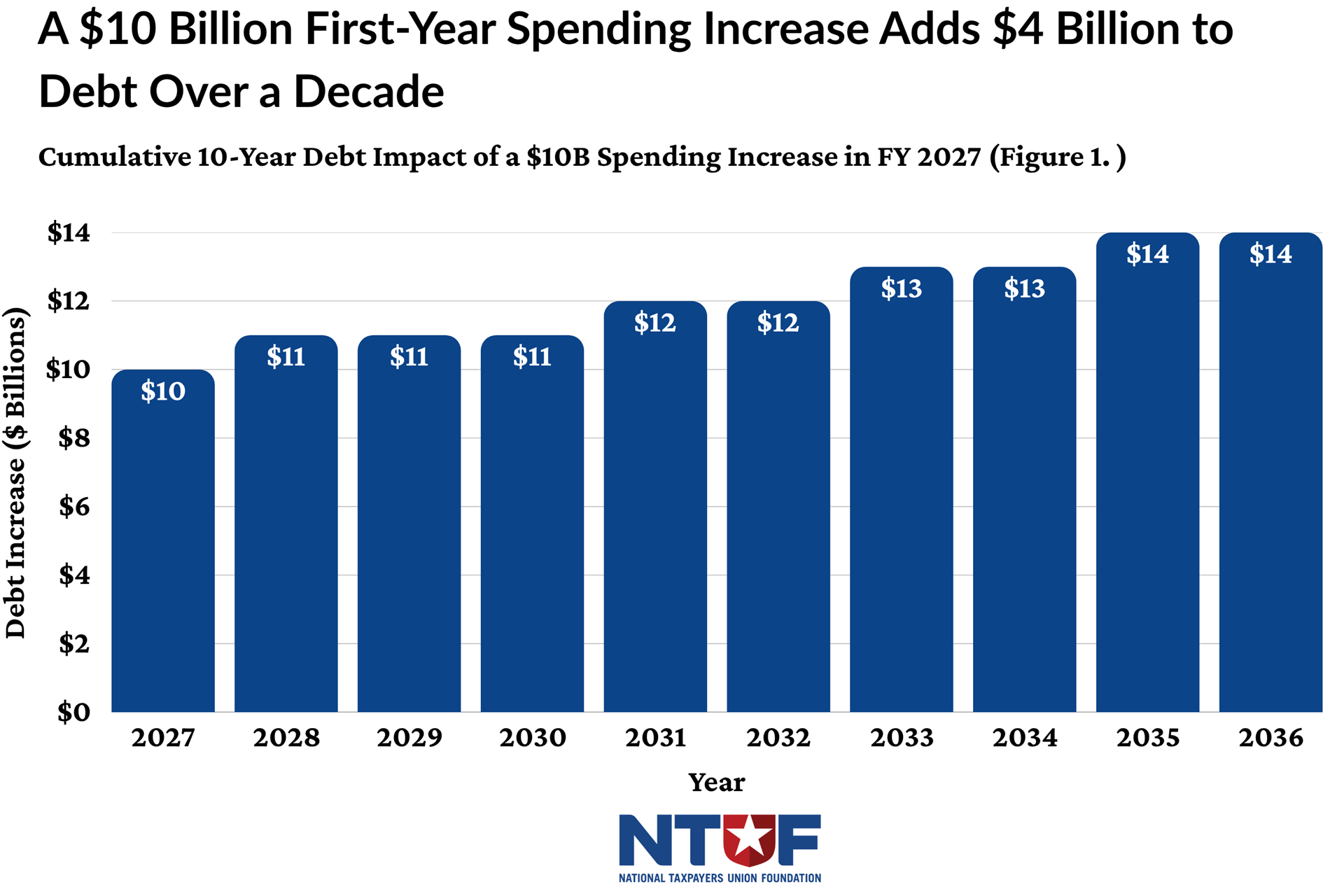 In its latest update this March, CBO shows that a $10 billion increase in spending in 2027 would cost roughly $14 billion over the ten-year budget window once borrowing costs are taken into account.
