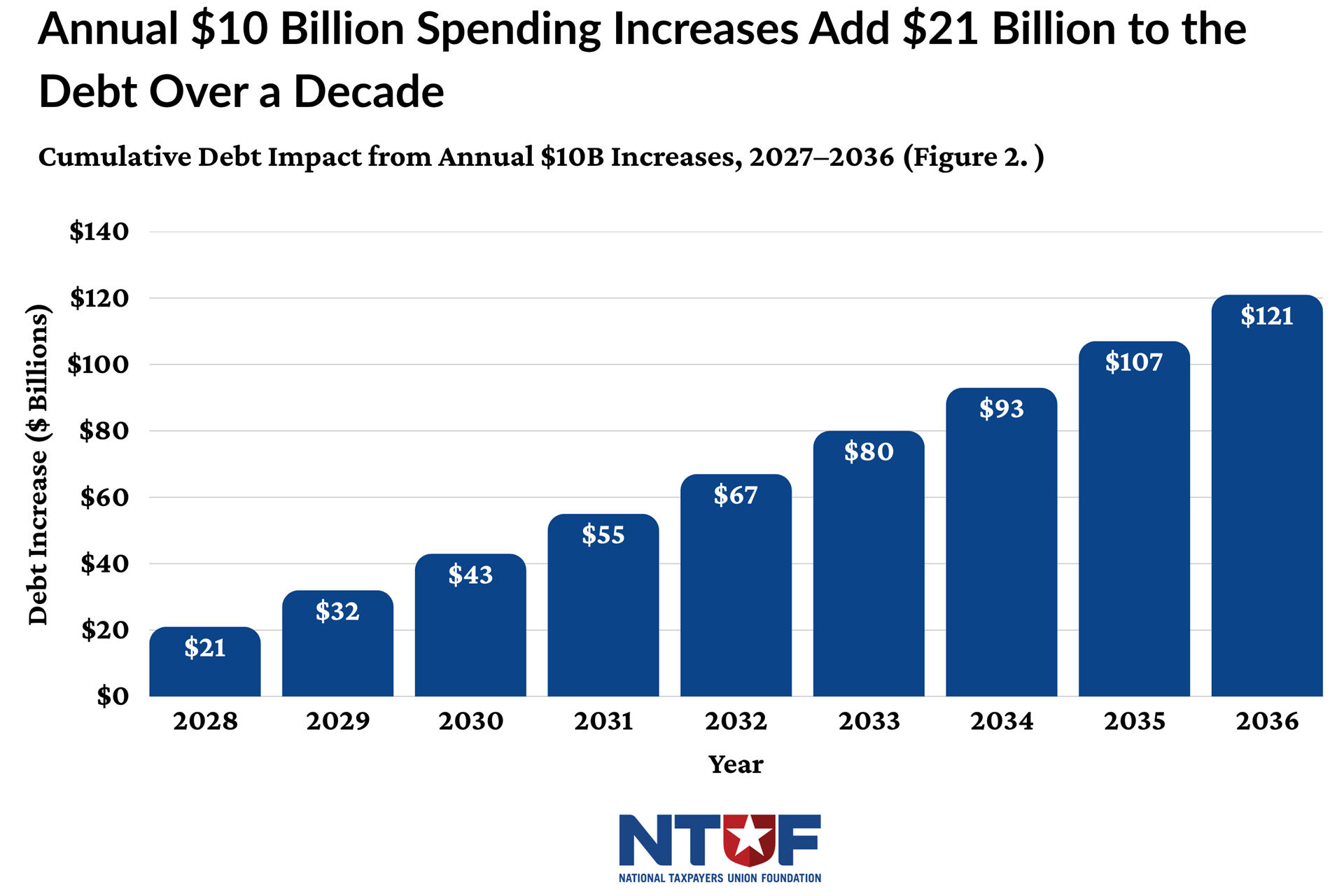 The dynamic becomes far more pronounced when the same policy is repeated. If lawmakers increase spending by $10 billion each year from 2027 through 2036, total outlays rise to $100 billion. However, including interest, the cumulative increase in debt reaches roughly $121 billion, with about $21 billion attributable to debt service alone. Figure 2 illustrates how quickly these costs compound.