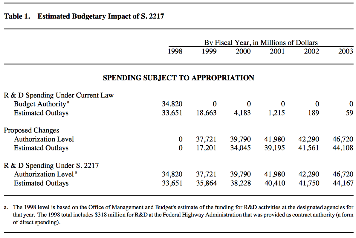 In fact, CBO’s reports previously included more of this information. For example, the following table is from a 1998 cost estimate for a bill to reauthorize federal research and development programs.[7]