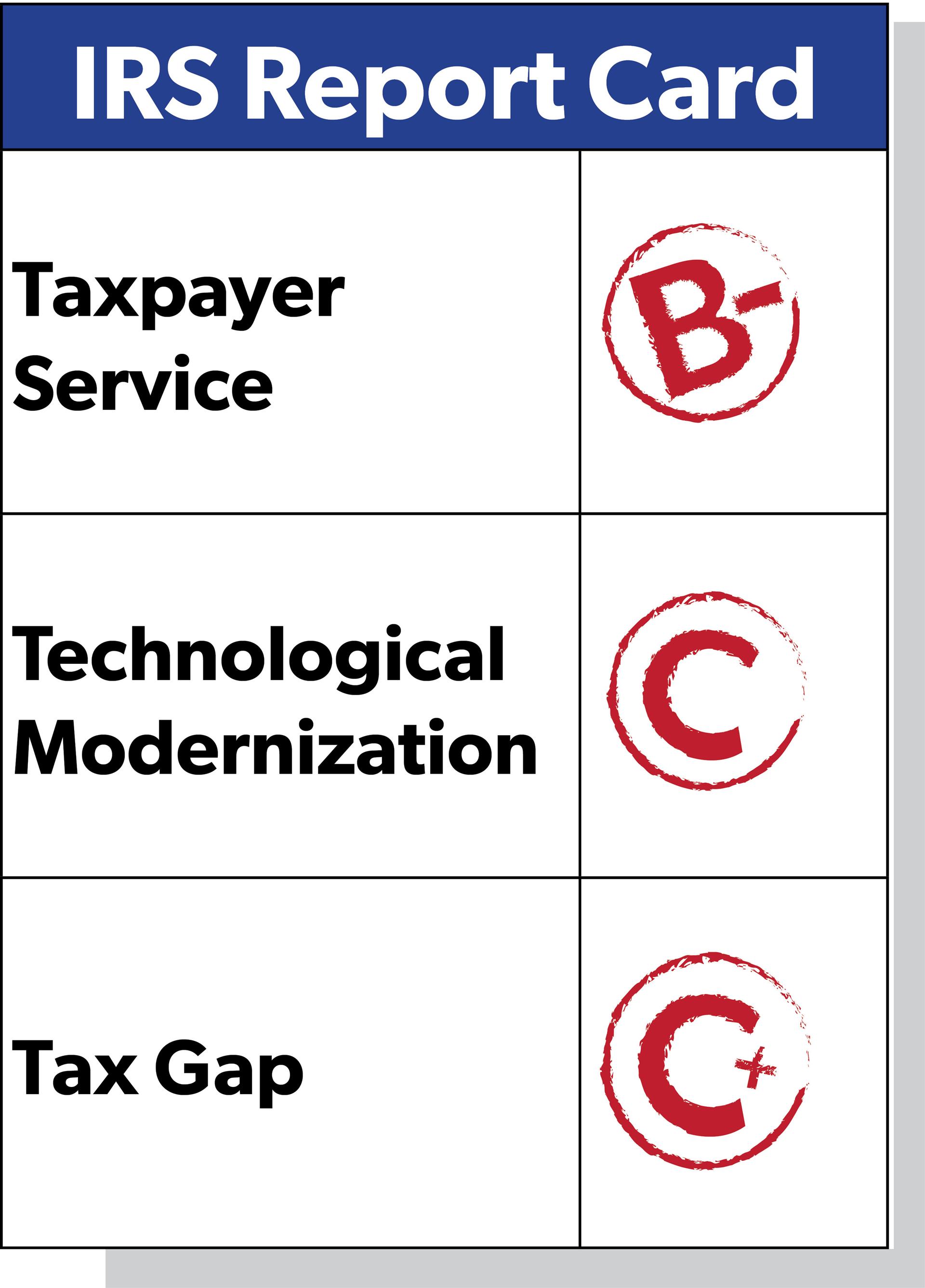 In light of information released during 2025 and early 2026, including data on the last tax filing season, we are conditionally upgrading the IRS’s grades. The IRS has earned a B- for taxpayer service, a C for technological modernization, and a C+ for closing the tax gap. While we are enthused about recent progress in improving taxpayer services and information technology, these letter upgrades are conditional upon the completion of deliverables that the IRS has promised to release soon.
