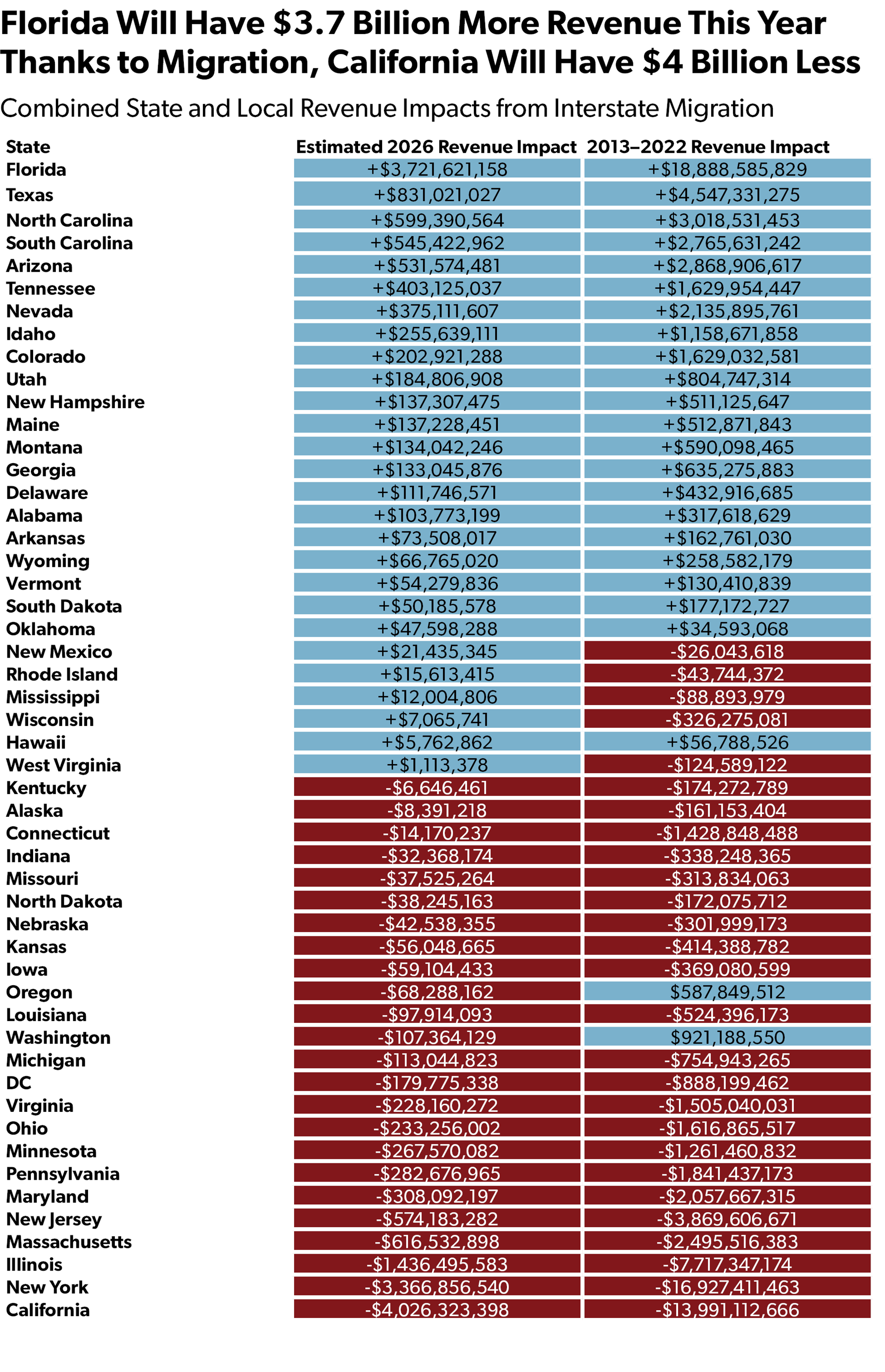 After all, a taxpayer who moves from California to Florida in 2013 does not merely stop paying taxes to California in 2013 — their tax dollars go to Florida for every subsequent year that they stay in Florida. This compounding effect can make the long-term impact of migration quite devastating (or, in the winners’ case, enriching) to a state’s budget.