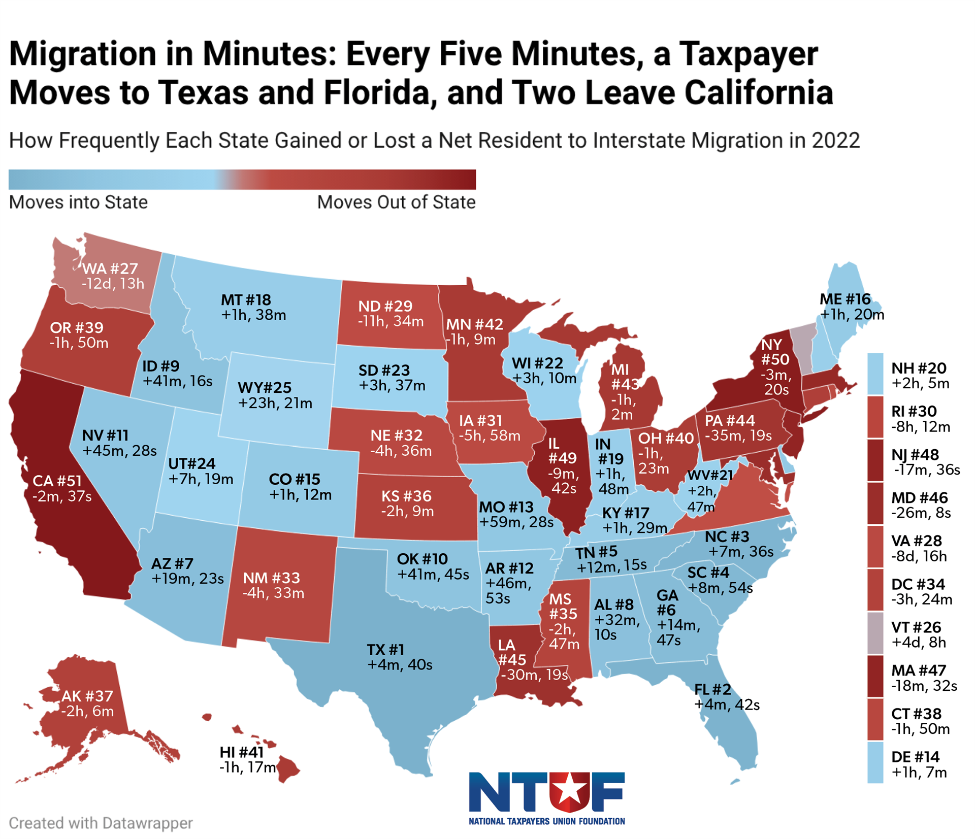 Movements of tens of thousands of Americans in and out of a state can be difficult to conceptualize. Our Migration in Minutes metric translates migration flows into how often a taxpayer leaves or enters a state. All frequency data is based on net migration.