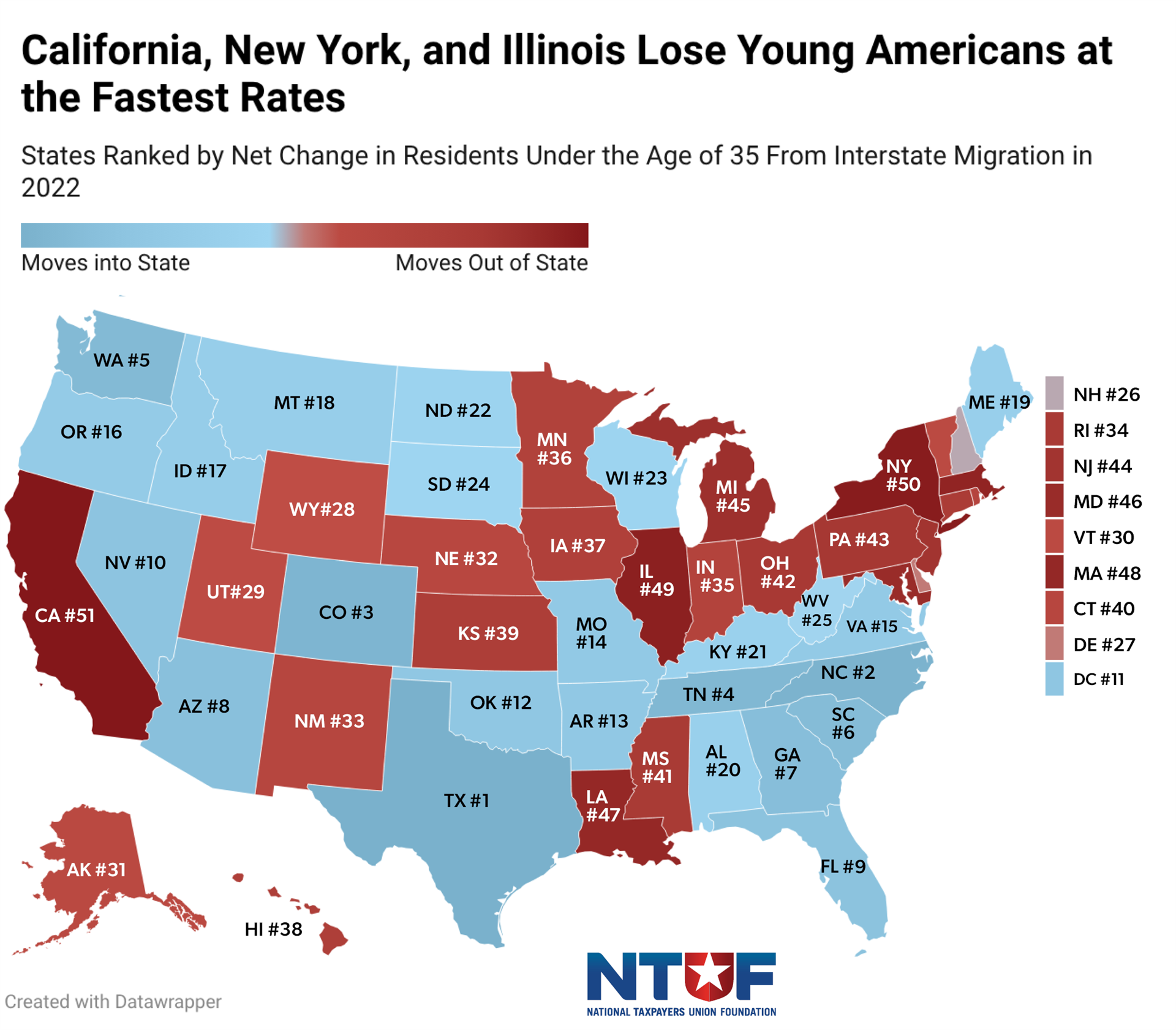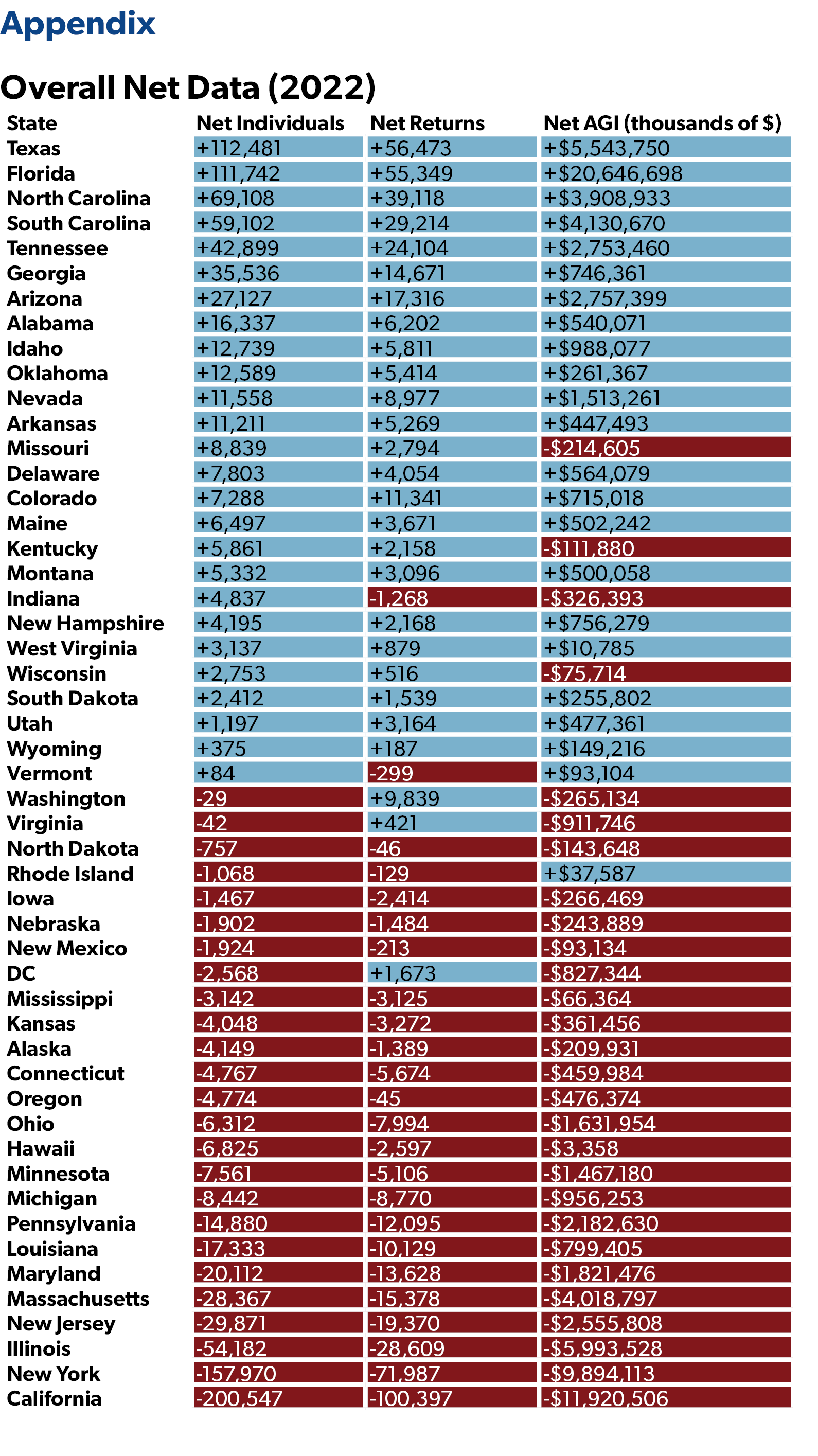 - Texas, Florida, North Carolina, South Carolina, and Tennessee were the biggest net winners from interstate migration, while California, New York, Illinois, New Jersey, and Massachusetts were the biggest net losers.