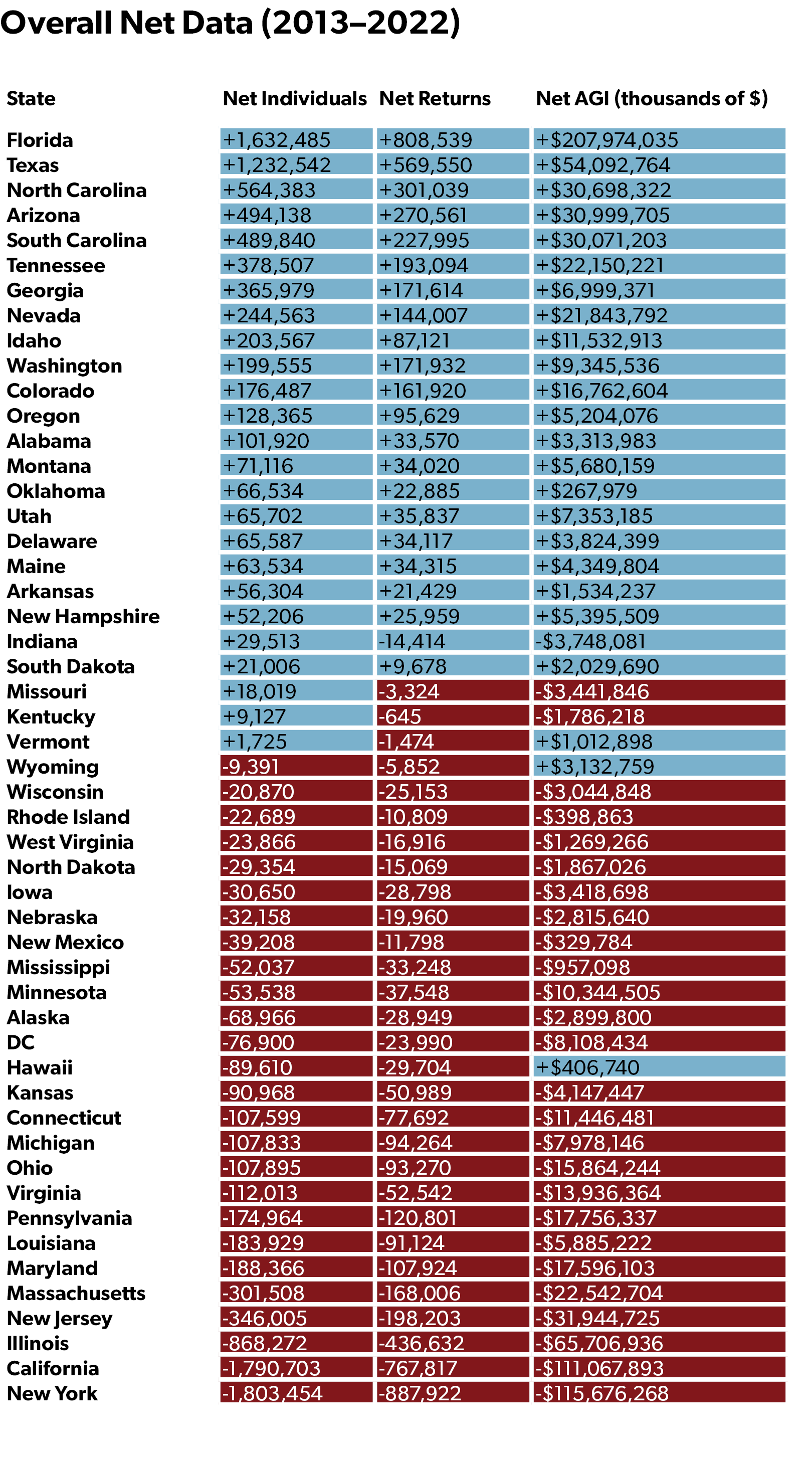 While migration rates can ebb and flow in a given year due to temporary factors such as mortgage rates or storms, trends are steadier over the long term. Between 2013 and 2022, Florida and Texas have siphoned 1.6 million and 1.2 million new residents from other states, respectively, while California and New York have each lost about 1.8 million residents.