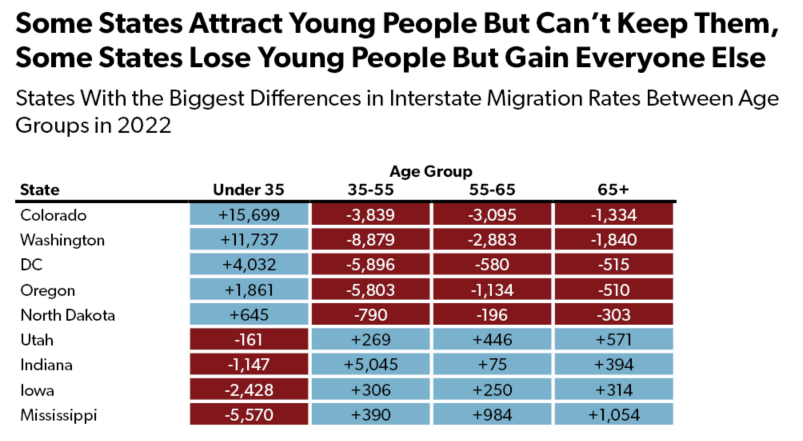 This works the other way as well, particularly for Indiana, but also, to a lesser extent, for Utah, Iowa, and Mississippi. Indiana suffers a net loss of 1,147 residents under the age of 35, but gains nearly five times that number in the next age group. This suggests that while Indiana is not gaining young people, it is siphoning off the next generation from nearby states with higher taxes and costs of living.