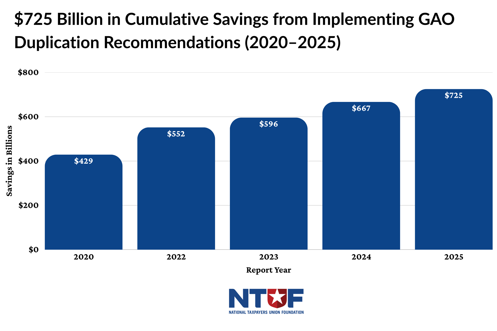 Since 2011, GAO has identified 2,049 instances of fragmentation, overlap, or duplication across the federal government. As of 2025, congressional and agency action on these findings has produced $725 billion in verified cumulative savings. Figure 1 tracks what happens when Congress actually acts on these findings: cumulative savings have grown from $429 billion in 2020 to $725 billion in 2025. Yet, 589 matters remain unresolved, with over $100 billion still available. Without a structured process to review federal programs and address duplication, many of these opportunities may remain unrealized.
