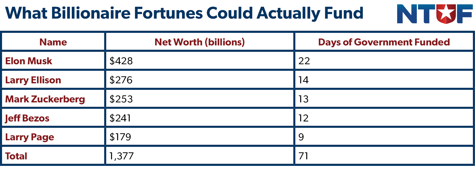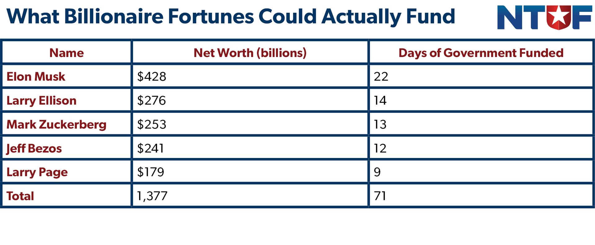 However, with the federal government currently spending $19.2 billion per day, even if the government was hypothetically able to tax the income of the wealthiest Americans at a 100% rate without imposing severe economic damage, that would only fund the government for 127 days. Completely confiscating the fortunes of the five richest billionaires would fund the government for little more than two months.