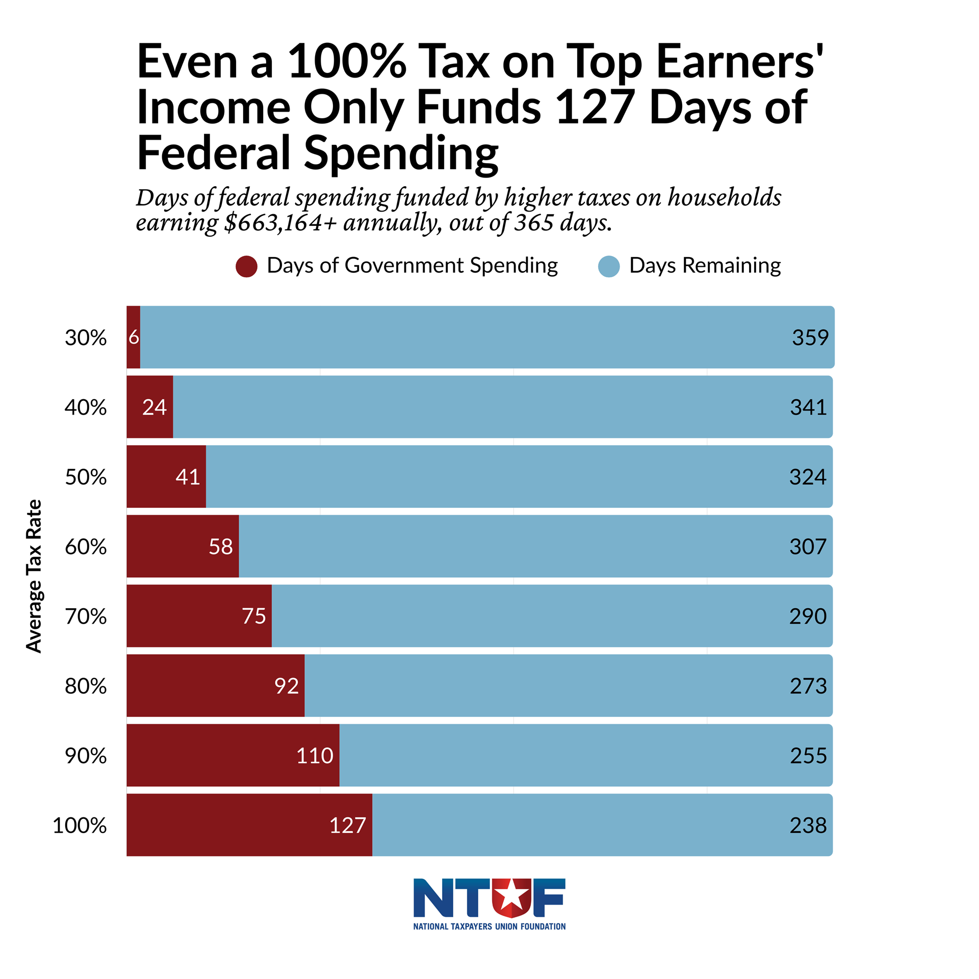 Even if the government werewas able to tax the income of the wealthiest Americans at a 100% rate, that would only fund the government for 127 days.