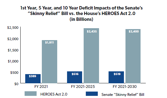 On net, the skinny relief bill would increase the 2021 deficit by $389 billion, and by $519 billion over the decade. House Democrats also scaled back their proposal for another round of pandemic and economic relief from $3.4 trillion in their original HEROES Act passed by the chamber in May to $2.4 trillion in the HEROES Act 2.0 passed by the chamber in early October. There is still a wide gap between the alternate versions.[13]