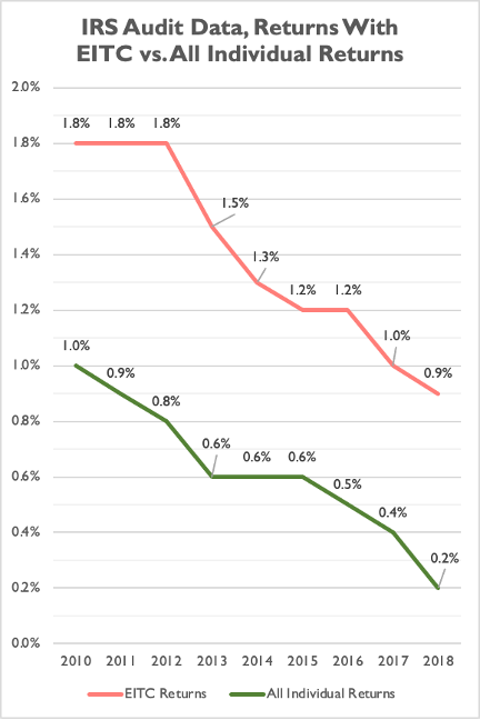 According to IRS data, audit rates on EITC returns were, indeed, higher than the audit rate for all individual returns from tax years 2010 through 2018.[14]