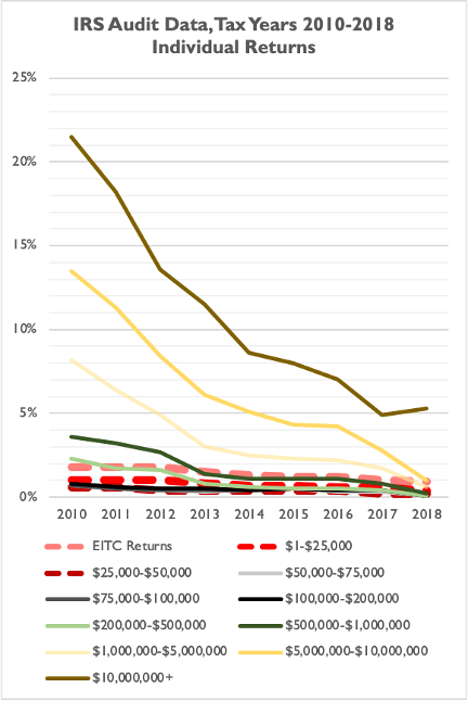 Much attention has been paid on Capitol Hill[11] and in the media[12] to the difference in audit rates between wealthy taxpayers and low-income taxpayers. Democrats on the House Committee on the Budget claimed in late 2020 that “[t]he burden of painful tax audits has shifted unfairly onto lower-income people who work for a living.”[13] These claims deserve further scrutiny.