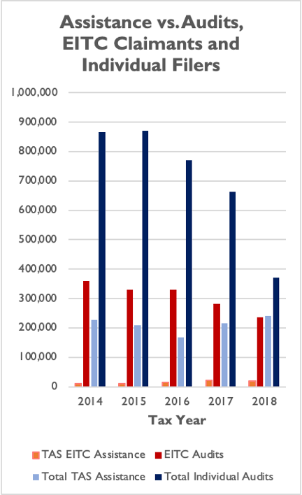 Of greater concern to lawmakers should be that the IRS appears to audit far more EITC claimants than they help through the Taxpayer Advocate Service (TAS) each year. That trend is mirrored by TAS assistance to all taxpayers, when compared to the amount of individual taxpayers audited by the IRS in a given year.[15] While measures of post-filing assistance are not a perfect proxy for how many EITC claimants turn to the agency for help, the data do demonstrate that only a fraction of the EITC claimants being audited each year are receiving assistance from TAS.
