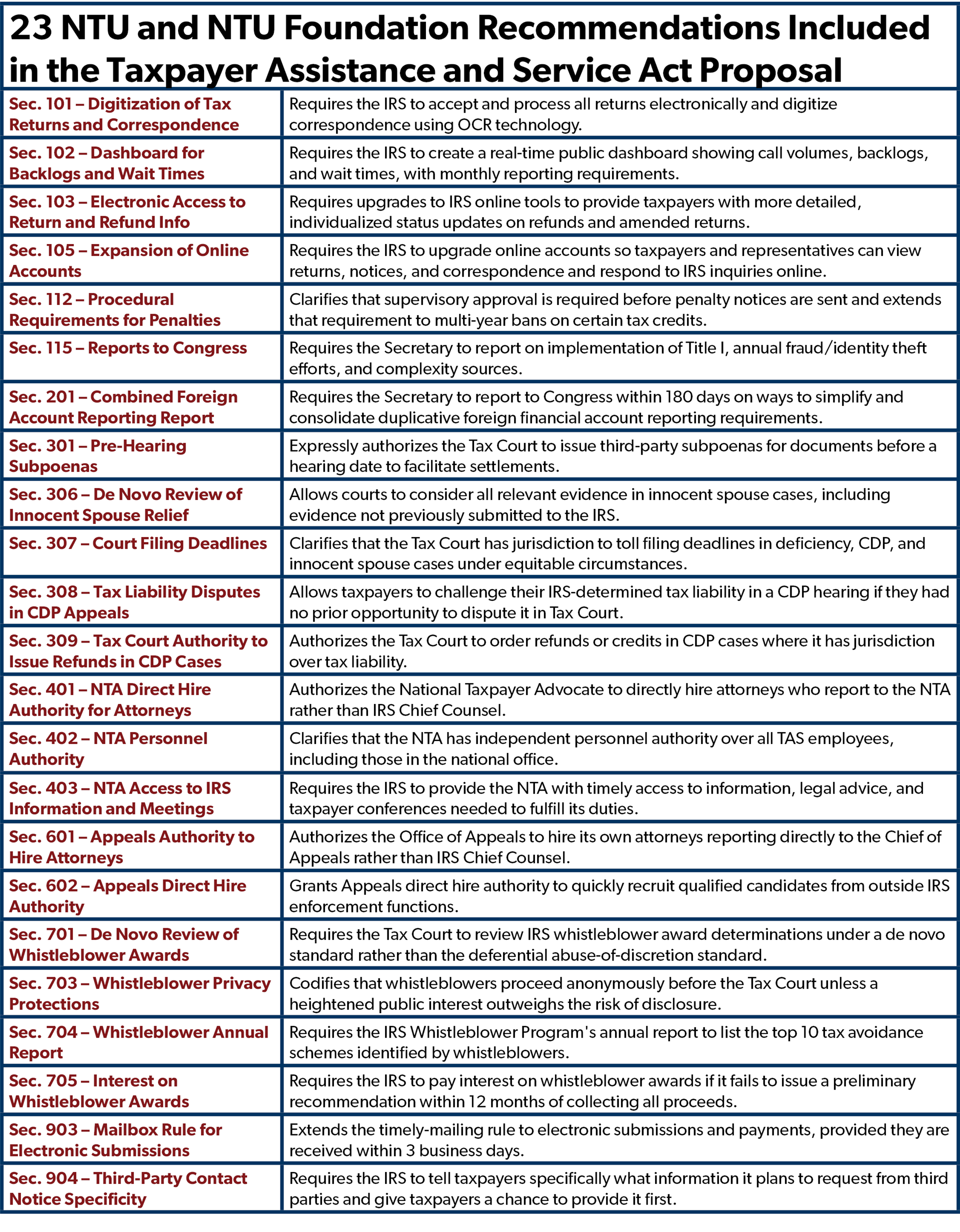 Since its circulation as a discussion draft in early 2025, the TAS Act has undergone changes to account for recent legislative activity and stakeholder feedback. NTU appreciates the Senate Finance Committee’s recent inclusion of many of our recommendations, including our suggestions to require annual reporting on tax complexity and to allow for electronic supervisory signature during the penalty assessment process. Overall, this package includes 23 proposals that NTU has recommended in recent years.