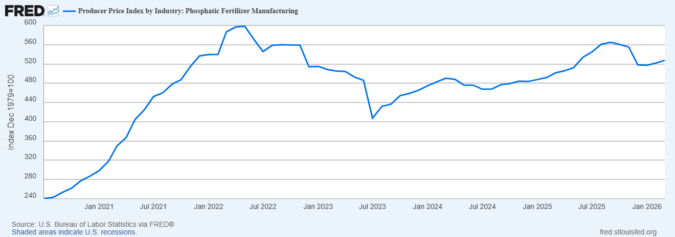 After the Commerce Department announced its investigation into phosphate fertilizer imports in 2020, prices soared. As of March 2026, the Producer Price Index (PPI) for phosphatic fertilizer manufacturing remained twice what it was in 2020. A study by Texas A&M’s Agricultural and Food Policy Center estimated CVDs increased the cost of phosphorus fertilizers by $6.9 billion from 2021 to 2025.